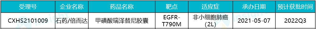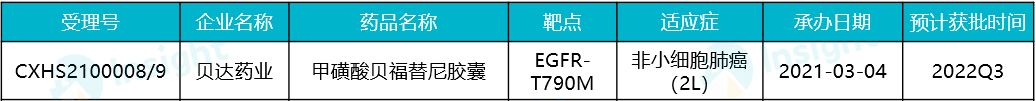 甲磺酸贝福替尼是贝达药业开发的一款针对 T790M 突变的第三代 EGFR-TKI,2021 年 3 月,贝达药业在国内递交上市申请,治疗既往使用 EGFR-TKI 耐药后产生 T790M 突变的局部晚期或转移性非小细胞肺癌。据 Insight 数据库显示,目前这项上市申请已经完成审评,获批在即。