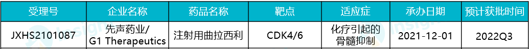 曲拉西利(Trilaciclib)是先声药业在 2020 年 8 月以总计 1.7 亿美元从 G1 Therapeutics 引进的产品,曾获 FDA 突破性疗法认定和优先审评资格,并于 2021 年 2 月在美国获批上市(商品名:COSELA™)。