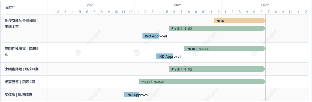 据 Insight 数据库,自 2020 年 8 月先声引进这款产品之后,同年 11 月即提交临床申请,获批之后迅速启动了针对小细胞肺癌、结直肠癌、三阴性乳腺癌三项适应症的 III 期临床试验。2021 年 11 月 29 日,先声药业宣布该药上市申请获受理。目前这项上市申请已经完成审评,获批在即。