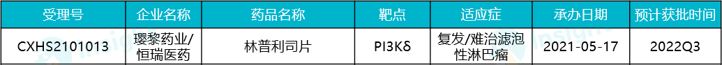 2021 年 5 月,林普利司治疗复发/难治滤泡性淋巴瘤的适应症申请获 CDE 受理,且被纳入优先审评程序。据悉,该药在 89 例(可评估病例)复发/难治滤泡性淋巴瘤患者中的客观缓解率(ORR)达 80% 以上,疾病控制率(DCR) 达 95% 以上。而且该药口服给药安全可控、耐受性好。恶心、腹泻、肝毒性等不良反应发生率低于同靶点药物文献报道。