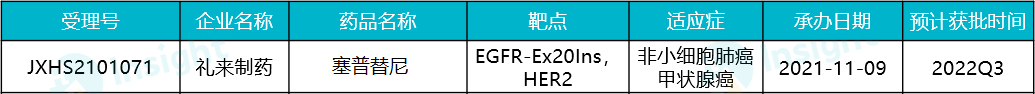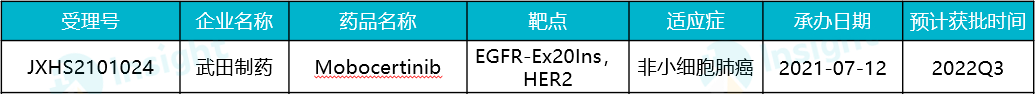 2021 年 7 月,Mobocertinib 在国内报产,随后被纳入优先审评,拟定适应症为:既往接受过化疗且携带表皮生长因子受体(EGFR)20 号外显子插入突变的局部晚期或转移性非小细胞肺癌(NSCLC)成人患者。