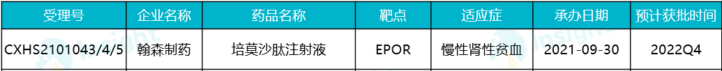 据Insight 数据库 显示,翰森制药在 2010 年 10 月首次提交培莫沙肽的临床申请,2015 年 1 月首次启动临床,并于 2021 年 9 月首次申报上市,用于因慢性肾脏病(CKD)引起贫血,且正在接受促红细胞生成素治疗的透析患者的治疗。