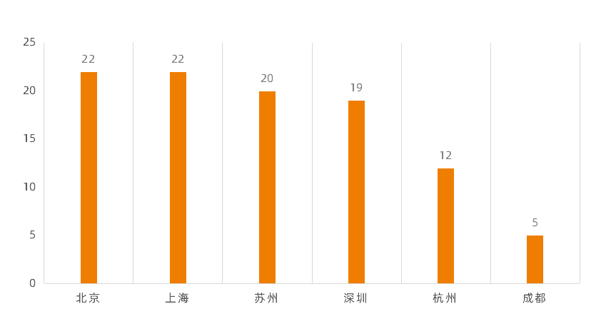 据统计,在今年上半年完成早期融资的121家医疗企业中,落地地点基本聚集在北京、上海、深圳、苏州四地,落地企业共有83家,占比达到68.6%。其中,上海和北京持平,共落地22家初创企业,苏州和深圳分别落地20家和19家。