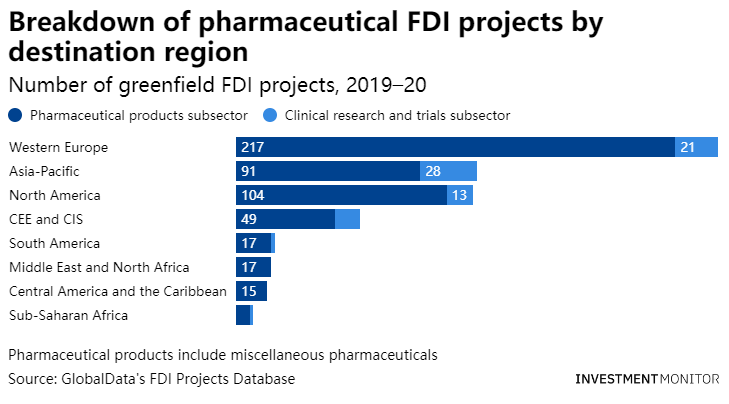 亚太和北美也是受FDI青睐的地方,尽管与2019年相比,2020年制药FDI在这些地区有所下降。