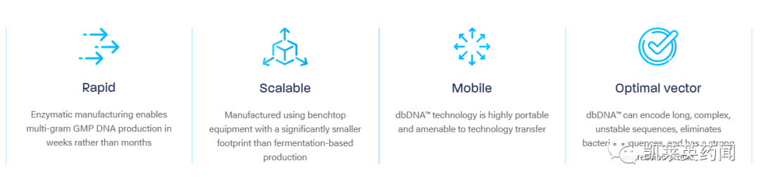 dbDNA形状酷似狗骨头,是一种最小的线性双链共价闭合DNA构建体,可以编码长的、复杂的或不稳定的DNA序列,不包含细菌序列,并具有很强的表达谱。该技术可以制造大于 20kb 的基因,并容纳在大肠杆菌中作为质粒 DNA 通常不稳定的,包括那些在病毒载体和 mRNA 生产中发现的序列;除 mRNA 疫苗外,还非常适合开发 DNA 疫苗等先进疗法。