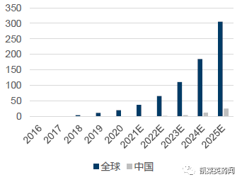 基因疗法是行业第三波革命浪潮,相比于小分子和抗体药物,基因疗法 (CGT) 的主要优势在于其单次治疗的长期化效果、对难治性适应症的覆盖以及潜在的更广泛的可成药靶点。根据Frost & Sullivan预测,全球CGT 市场空间预计从2020 年的20.8亿美元增长至2025 年的305.4 亿美元, 复合增速71.1%。其中,中国将是增长最快的市场,从2020年的2亿美元增长至2025年的17亿美元,复合增速51.1%。