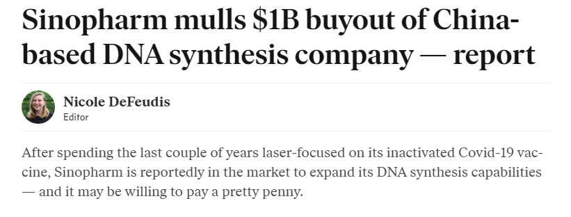 近日,据外媒报道,国药集团考虑收购BBI生命科学(BBI Life Sciences)以增强其DNA合成能力,后者估值可能超过10亿美元。据悉,国药集团已与该公司创始人王启松家族进行了谈判,具体事项未披露。