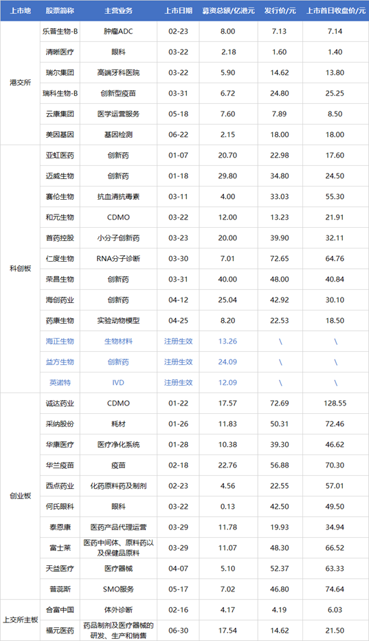 例如,在创业板,CDMO 公司六合宁远、冠心病介入器械公司垠艺生物、医疗器械流通公司建发致新、器械治疗及病房护理器械公司天助畅运IPO 获受理;在科创板,培养基和大分子 CDMO 公司奥斯康生物、合成生物学公司弈柯莱、创新药研发公司必贝特、医学影像设备公司明峰医疗、IVD 与疫苗开发商荣盛生物、基因检测与基因合成联川生物IPO 获受理;另外,医用低温存储公司中科美菱 IPO 获北交所受理;大分子创新药公司宜明昂科港交所IPO 获受理,疫苗与生物制剂研发公司绿竹生物递交港交所 IPO 申请。