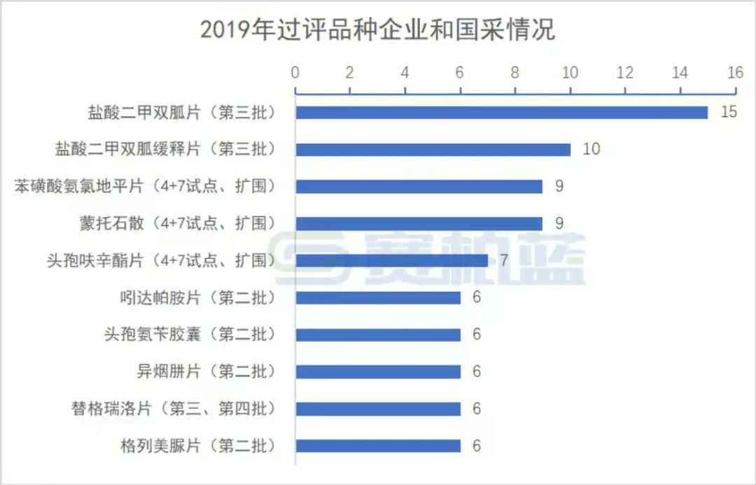 2019年各品种的过评企业数量(排名前十)和国采中标情况见下图