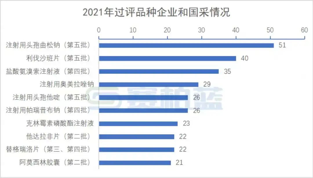 2021年各品种的过评企业数量(排名前十)和国采中标情况见下图