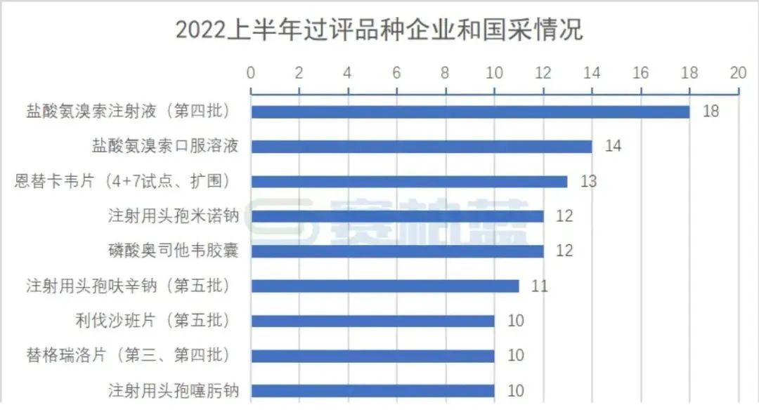 2022上半年各品种的过评企业数量(排名前十)和国采中标情况见下图