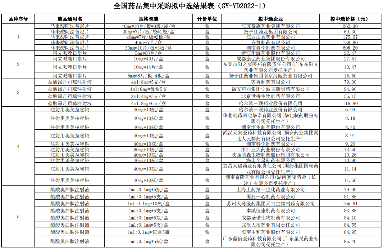 附件:全国药品集中采购拟中选结果表(GY-YD2022-1)