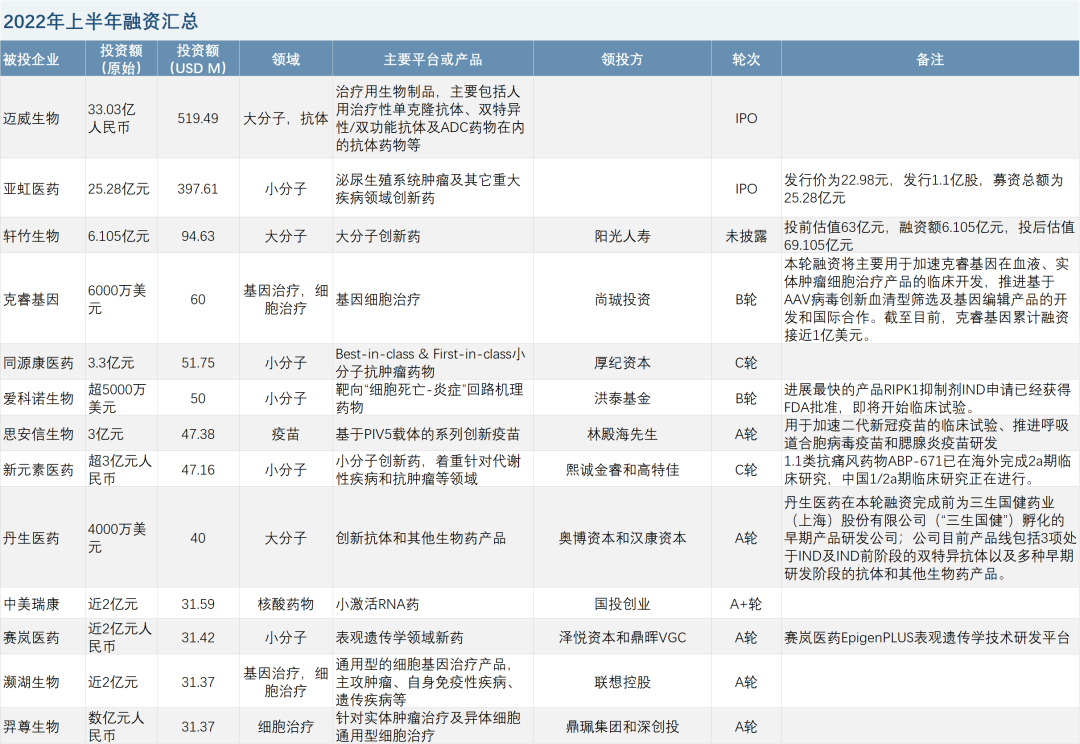 2022年上半年融资情况汇总