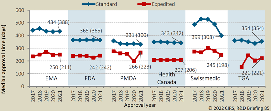 其他各国的药品监管机构的加快上市程序有着类似的效果。对于未获得优先审评资格的药品来说,在2021年,从向FDA递交NDA到获得批准上市的中位时长为365天,而优先审评的药品则可将这一时间缩短123天,大大加速创新药物的上市及临床应用。其他国家/地区如欧盟、日本、加拿大等的优先审评政策也均可缩短药品审评审批耗时26%-46%不等。