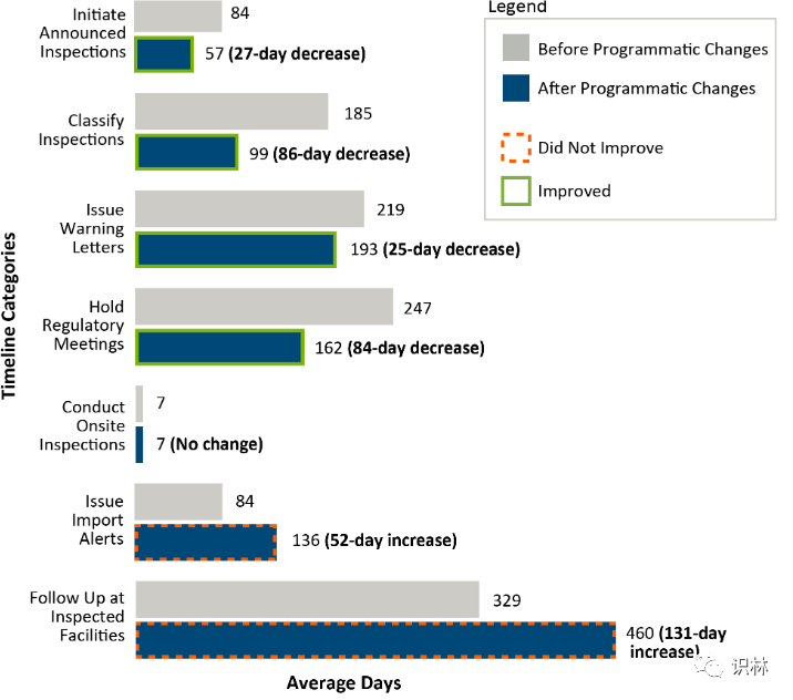 报告中发现:(1)启动检查,(2)分类检查,(3)发布警告信,以及(4)召开监管会议的时效性在实施计划变更后有所改进。然而,在计划变更后进行现场检查的时效性并没有改变,并且:(1)发布进口警报和(2)对先前归类为OAI的被检查设施进行跟进的时效性在计划变更后没有改进(图1)