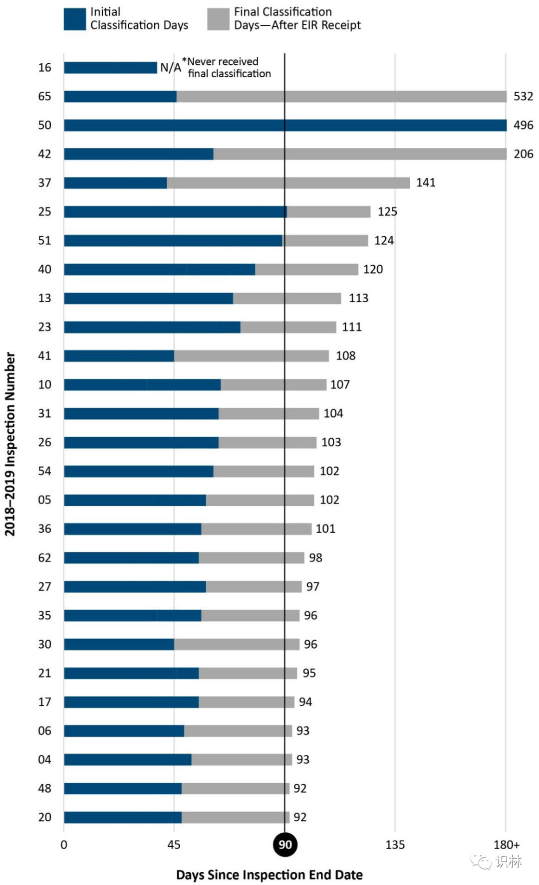FDA并不总是根据其政策和程序中规定的时间范围对海外场地有因检查进行分类。在FDA的计划变更之后,FDA在68项海外场地有因检查中的27项(40%)没有在检查结束后90天内完成最终分类(图2)。
