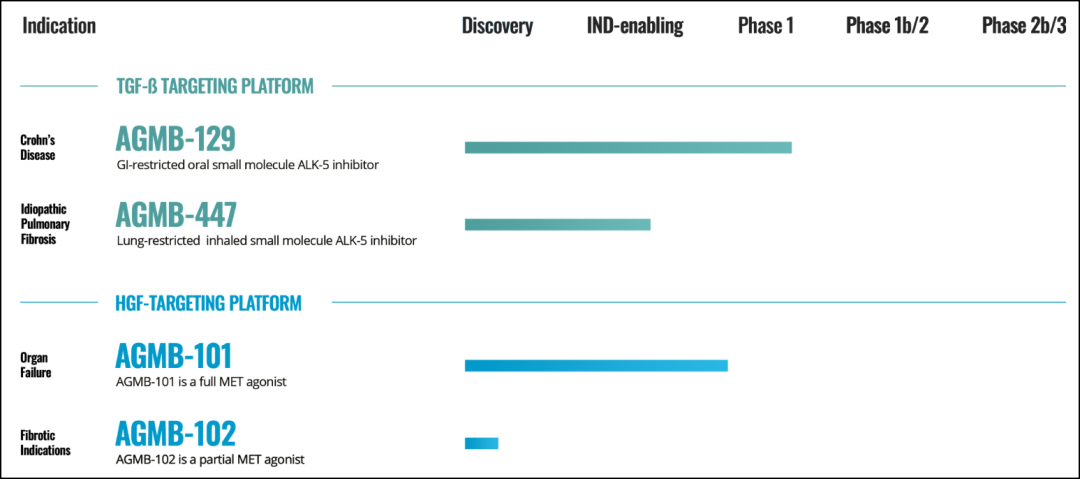 Agomab的管线包括其主要候选药物AGMB-129,这是一种胃肠道限制性ALK-5抑制剂用于治疗纤维狭窄性克罗恩病,目前正在健康志愿者的1期临床试验中进行研究。第二个靶向TGF-β的候选药物AGMB-447是一种肺限制性ALK-5抑制剂正在开发用于治疗特发性肺纤维化。AGMB-101是一种针对MET受体的完全激动剂正在开发用于治疗器官衰竭。这两种临床前候选药物AGMB-447和AGMB-101目前都在进行IND研究。此外,Agomab最近使用部分MET受体激动剂AGMB-102扩大了其研发管线,用于一系列纤维化适应症。