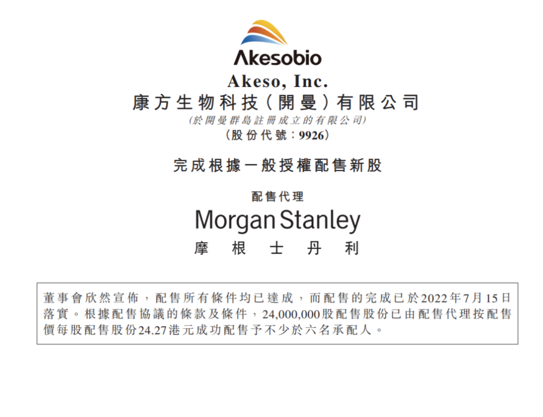 2022年7月15日,康方生物发布公告称,已经完成根据一般授权配售新股,配售代理为摩根士丹利。