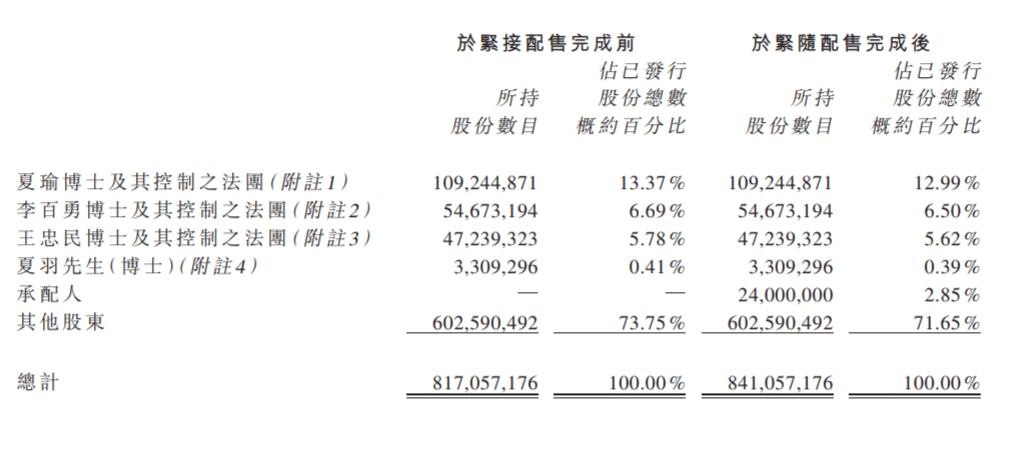 康方生物于紧接配售完成前及紧随配售完成后的股权架构如下: