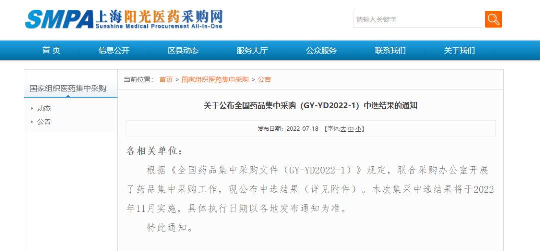 今日(7月18日),国家组织药品联合采购办公室发布了《关于公布全国药品集中采购(GY-YD2022-1)中选结果的通知》。公告表示,本次集采中选结果将于2022年11月实施,具体执行日期以各地发布通知为准。此次集采有60种药品采购成功,中选药品平均降价48%,涉及31个治疗类别,不仅包括高血压、糖尿病、抗感染、消化道疾病等常见病、慢性病用药,也包括肺癌、肝癌、肾癌、肠癌等重大疾病用药,按约定采购量测算,预计每年可节省费用185亿元。
