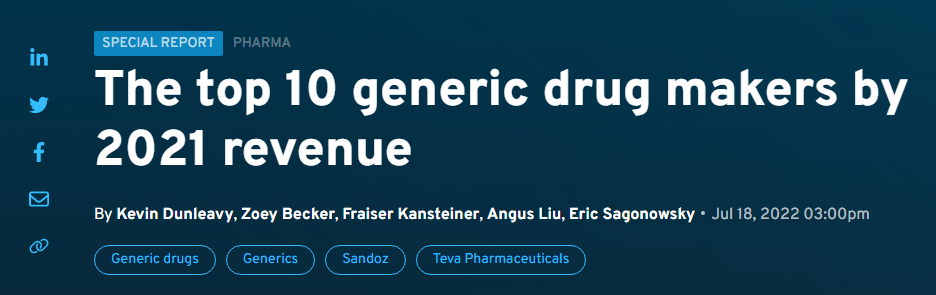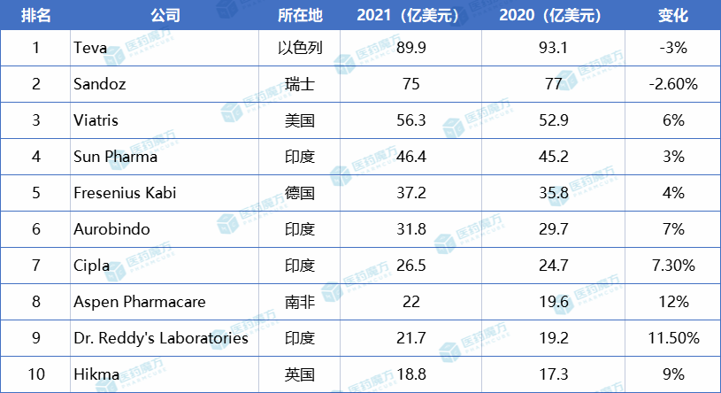 7月18日,FiercePharma发布了2021年全球仿制药巨头TOP10榜单。