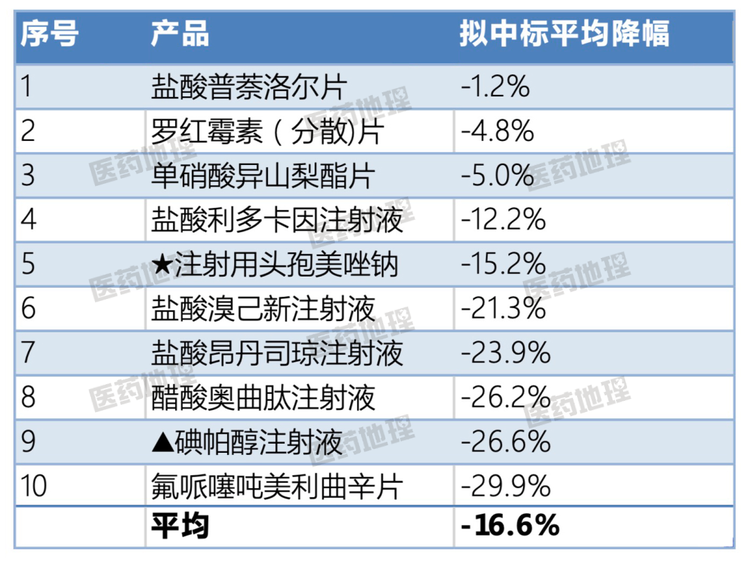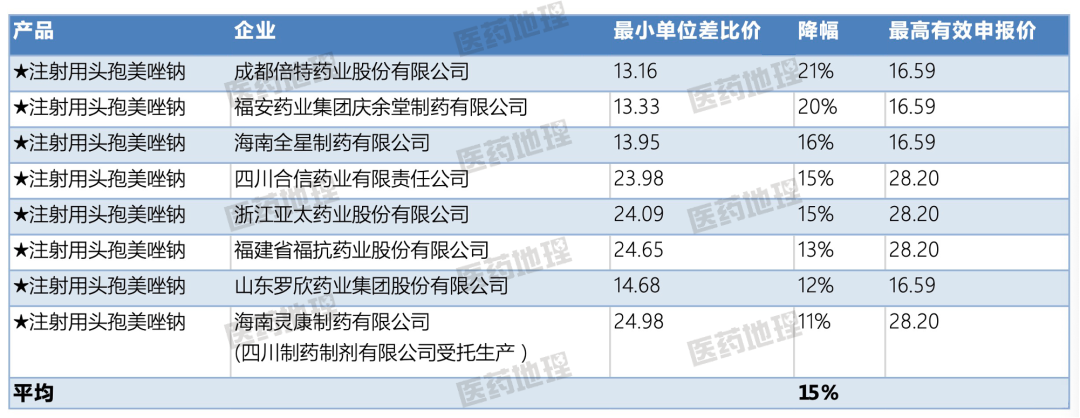 注射用头孢美唑钠共8家企业拟中选,属于竞争最为激烈的药品之一,不过该产品的最高降幅仅21%,最低降幅为11%,平均降幅15%,相较本轮集采48%的平均降幅以及不少动辄90%的降幅来说,是一个比较低的让步。