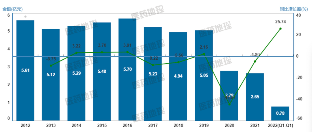 头孢美唑钠是临床上常用的第二代头孢菌素,可用于治疗由对头孢美唑钠敏感的金黄色葡萄球菌、肺炎杆菌等引起的感染症状。根据PDB样本医院市场数据,2012年-2019年,头孢美唑钠样本医院销售额较为平稳,总量维持在5亿元左右,属于临床大品种。不过2020年,该产品样本医院销售额断崖式下滑至2.78亿元,同比负增长-44.87%,2021年继续维持了2020年以来的颓势。