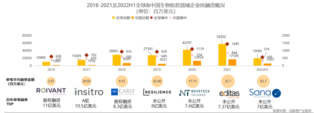 2016至2021年,除2019年出现投融资的小低谷外,一级市场整体投资热情持续走高,特别是2020和2021年的数量和金额都有明显提升,国内与全球的表现趋势一致。2022H1,在全球和国内均在资本冷静期的大环境下,单笔平均融资额非常可观,可见融资遇冷的情况下,有价值的创新项目仍获资本追捧。