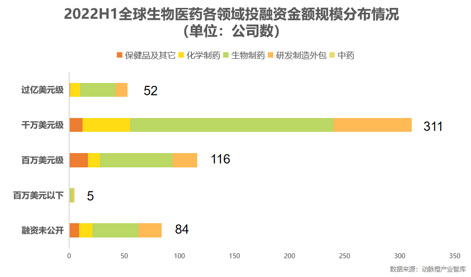 二、全球来看,早中期项目还是资本出手重地,过亿美元量级的大手笔投资明显减少,市场趋于谨慎。生物药最抢手,研发制造外包服务次之;