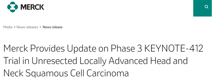 7月21日,默沙东公布Keytruda(帕博利珠单抗)联合放化疗(CRT)用于未切除的局部晚期头颈部鳞状细胞癌(HNSCC)患者的III期KEYNOTE-412研究未达到改善无事件生存期(EFS)的主要终点。