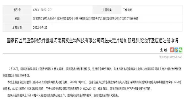 7月25日,国家药监局官网宣布:根据《药品管理法》相关规定,按照药品特别审批程序,进行应急审评审批,附条件批准河南真实生物科技有限公司阿兹夫定片增加治疗新冠病毒肺炎适应症注册申请,用于治疗普通型新型冠状病毒肺炎(COVID-19)成年患者。