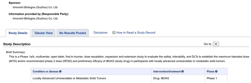 2022年7月14日,信达生物发布了一项I期临床试验(NCT05458219),这正式开启了IBI343(信达生物首款ADC)在局部晚期不可切除或转移性实体瘤受试者中的首次人体研究。