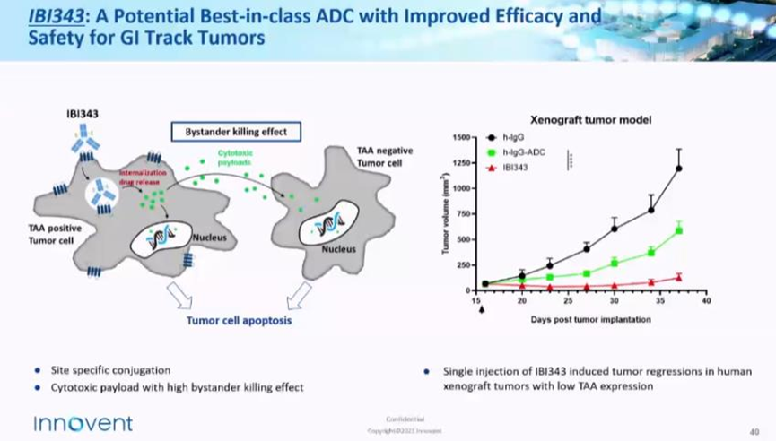 IBI343是信达生物的首款ADC,以claudin18.2为靶点,该ADC具有旁观者效应,能够杀灭特异抗原低表达癌细胞。根据信达生物公布的数据可知:单针注射IBI343,可以显著抑制低抗原表达的异种移植模型鼠肿瘤生长,并保持肿瘤在21天内一直处于低位水平。
