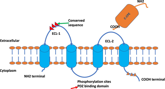 图注:Claudin 蛋白结构,具有两个细胞外环 (ECL)、ECL-1 和 ECL-2的四个跨膜结构域 (TMD)[1]。