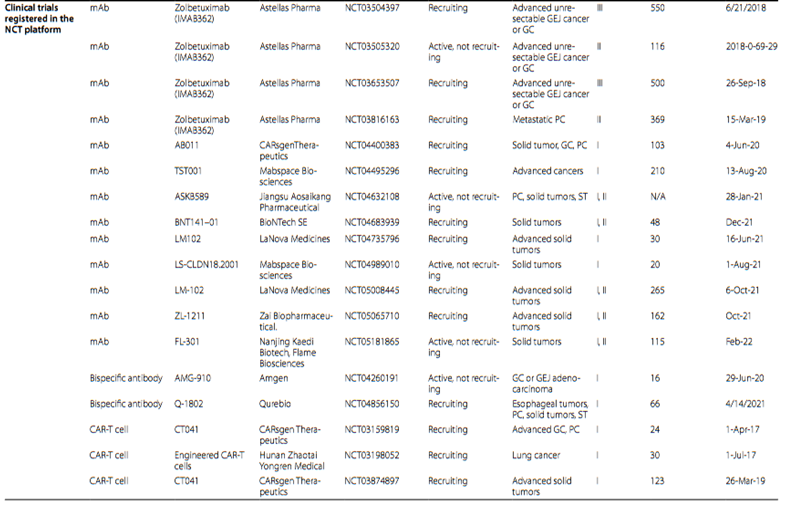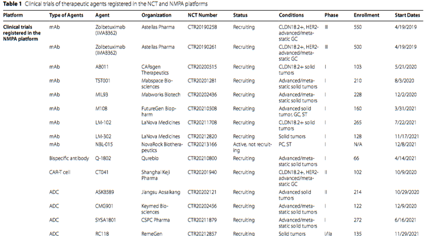 图注:NMPA和NCT平台中与CLDN18.2相关的临床试验进展情况[1]