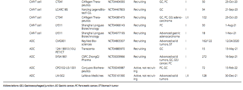 在我国,与claudin18.2相关的临床试验,截至2022年1月,中国药监局(NMPA)网站正在进行的试验15项;临床试验网站(NCT)28项;(其中III期临床试验4项、4个II期、8个I/II期和27个I期临床试验)。这些试验大多集中在实体瘤上,包括晚期不可切除的胃癌(GC)、胃食管连接处(GEJ)癌、转移性食管癌和胰腺癌[1]。