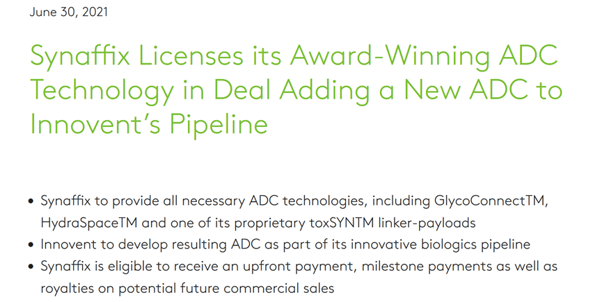 据悉,在2021年6月,信达生物与Synaffix B.V. 公司签订一项非排他性的、针对特定靶点的许可协议。在这项合作中,Synaffix 将提供专有 ADC 技术,包括 GlycoConnect™ , HydraSpace™ 以及其 toxSYN™平台下某款连接体-毒素,使信达生物得以快速基于一款自有抗体开发具有同类最优潜力的 ADC 候选分子。