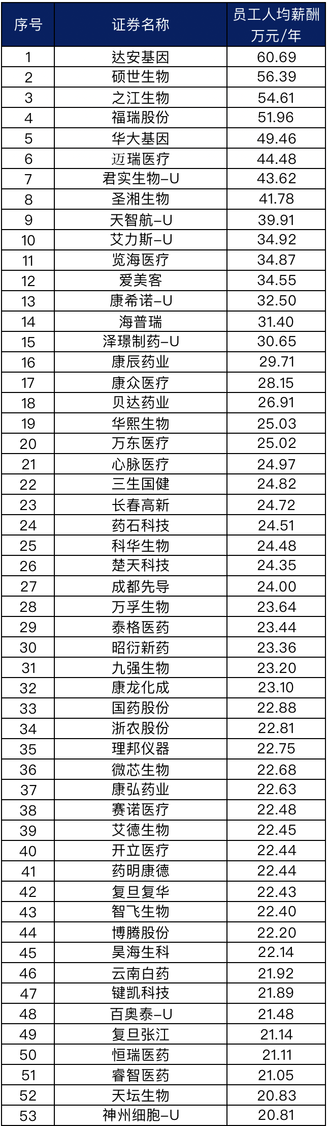 员工平均年薪超过20万的有65家,其中包含康辰药业、贝达药业、泰格医药、国药股份、药明康德、云南白药、恒瑞医药等知名药企。