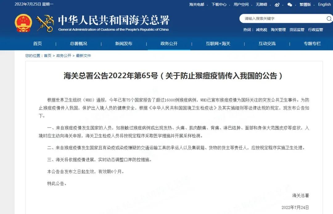7月25日,中华人民共和国海关总署网站发布《海关总署公告2022年第65号(关于防止猴痘疫情传入我国的公告)》: