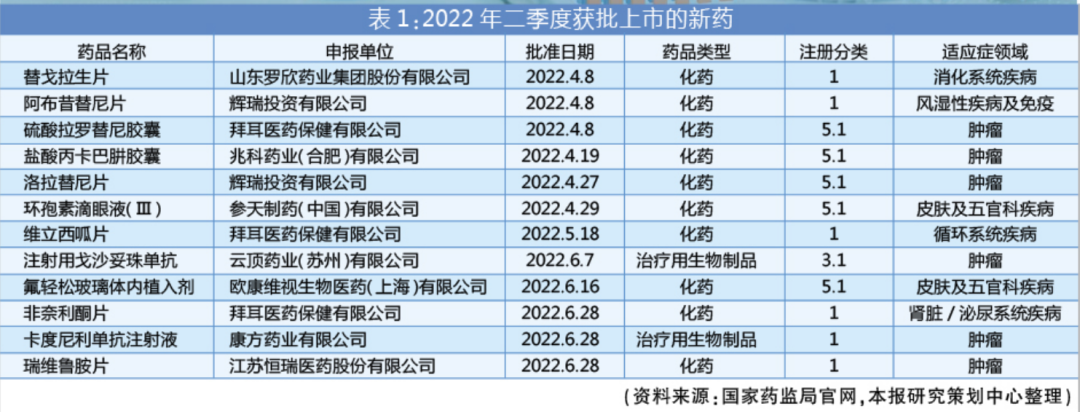 据国家药监局、CDE官网已披露数据,本报研究策划中心初步统计,今年上半年,国家药监局共批准了28个新药,包括17个化药、10个生物制品(包括1个疫苗)和1个中药。其中,抗肿瘤药物占据半壁江山,达到14个。今年第二季度获批的新药较一季度略有减少,为12个(改良型新药未纳入统计),包括10个化药与2个生物制品。以下对二季度获批新药看点进行分析。