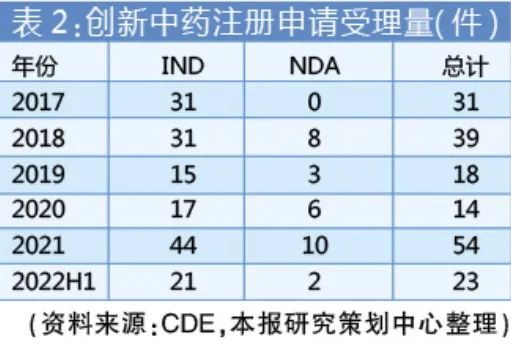 受2015年“药物临床试验数据自查”影响,2016年后中药新药上市许可申请(NDA)受理、中药新药临床试验申请(IND)受理和批准数量均大幅下降,2017年以来,中药新药申报开始恢复。而随着中药注册分类改革实施和审评审批体系持续完善,2021年创新中药NDA、IND受理量创近五年新高。今年上半年,这一趋势也得到了一定的延续,虽然创新中药NDA受理量有所滑落,仅有2个,但IND受理量达21个。