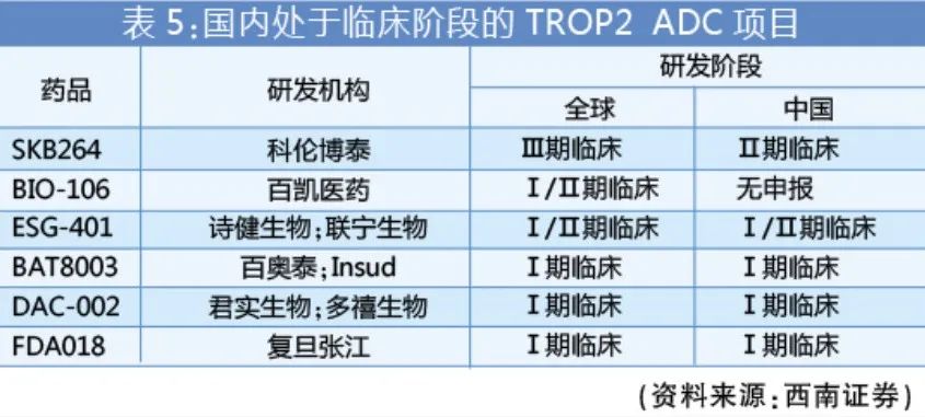 不过,ADC药物靶点布局扎堆严重值得重视。TROP2(在ADC药物中的占比为9.9%)也属于国内ADC药物研发的热门靶点,仅次于HER2(38.4%)与EGFR(11.9%)。西南证券研报指出,截至今年5月,全球共有16个TROP2 ADC在研项目,中国企业在该领域最为积极,主导或参与了12个项目。