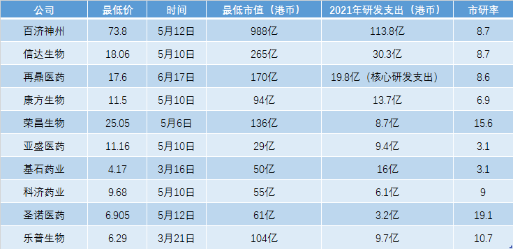 10家港股生物科技底部市研率