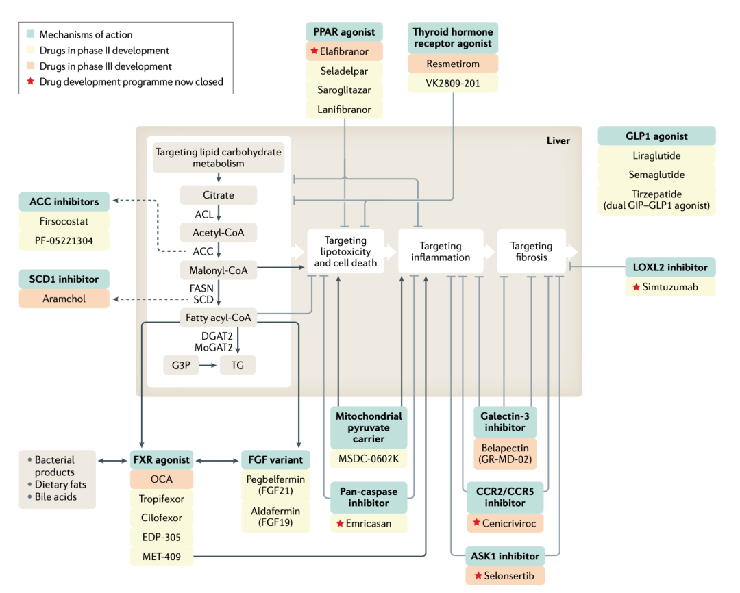 近年来,随着对NASH机制的深入了解,许多新型的NASH药物被开发出来,主要针对于NASH三种不同的疾病过程——脂肪变性、炎症和纤维化,机理上可分为四大类: