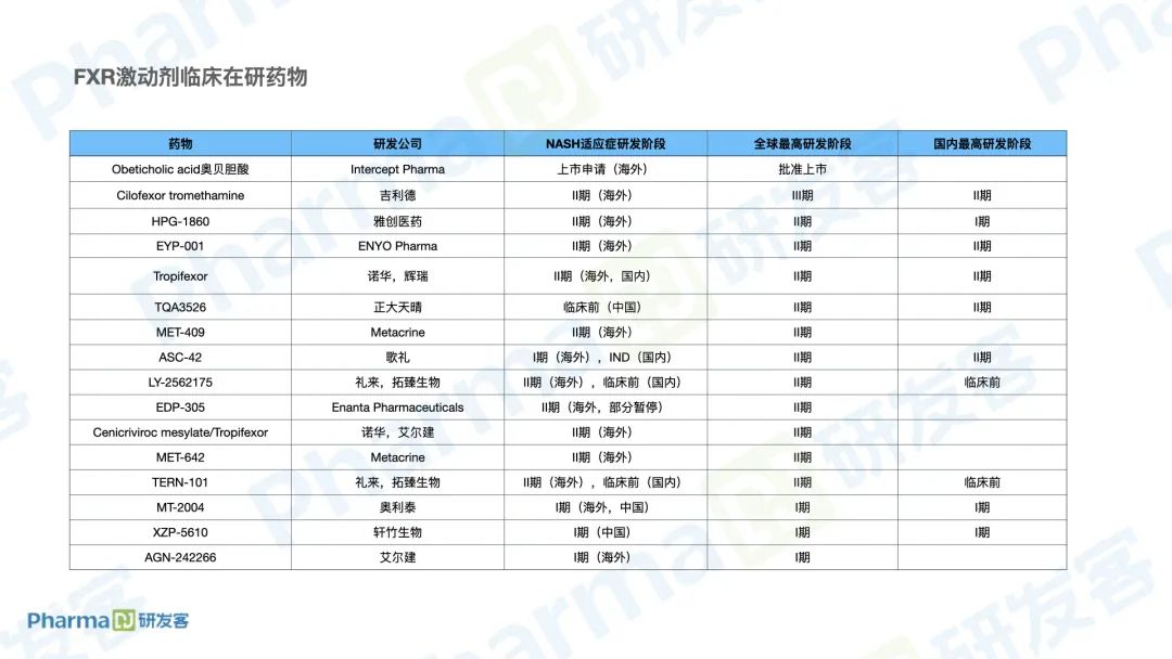 据研发客统计,截止目前,全球共有16款FXR激动剂进入临床并在开展针对NASH的研究,其中有10款在国内进行开发。