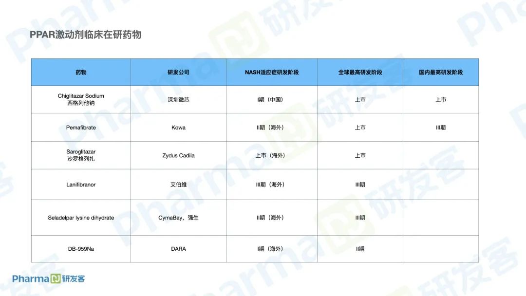 Genfit公司的PPARα和PPARδ的双重激动剂elafibranor是此类药物的代表。2019年,拓臻生物以3500万美元的首付款和1.93亿美元的里程金获得了该药物治疗NASH和原发性胆管炎(PBC)在大中华区的独家开发和推广权益。