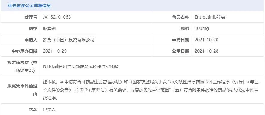 2021年10月,中国国家药品监督管理局药品审评中心(CDE)受理了恩曲替尼胶囊的上市申请,并将其纳入优先审评。根据优先审评公示信息,该药本次申请拟用于治疗NTRK融合阳性局部晚期或转移性实体瘤。