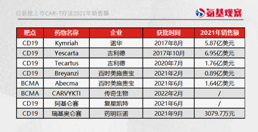 其中,销量最好的是吉利德的Yescarta。上市四年,Yescarta 2021年销售额为6.95亿美元,在总销售额不及市场预期的情况下,销售增速已经有所放缓。