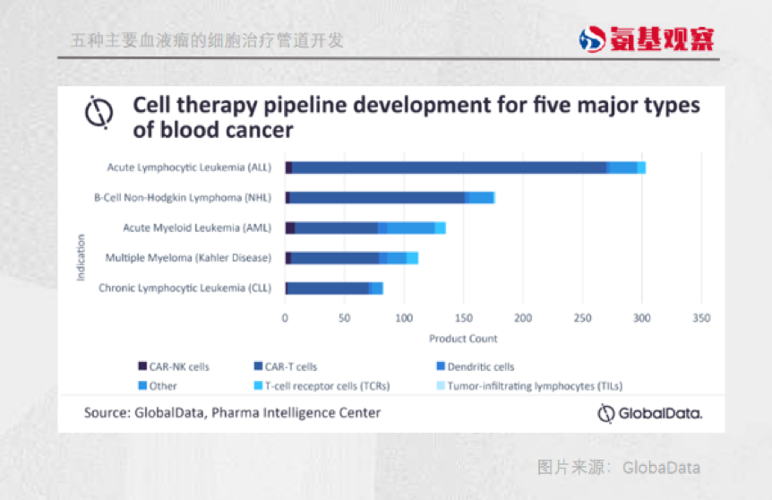 根据GlobalData数据,目前全球有800多种针对血液瘤的细胞治疗产品处于临床阶段,其中绝大多数为CAR-T疗法。而这些CAR-T疗法研发的适应症,又主要集中在五种血液瘤上。
