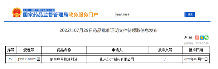 7月29日,药监局官网显示,礼来的依奇珠单抗新适应症获批上市,推测用于治疗成人活动性放射学阳性中轴型脊柱关节炎(r-axSpA,又称强直性脊柱炎,AS)。